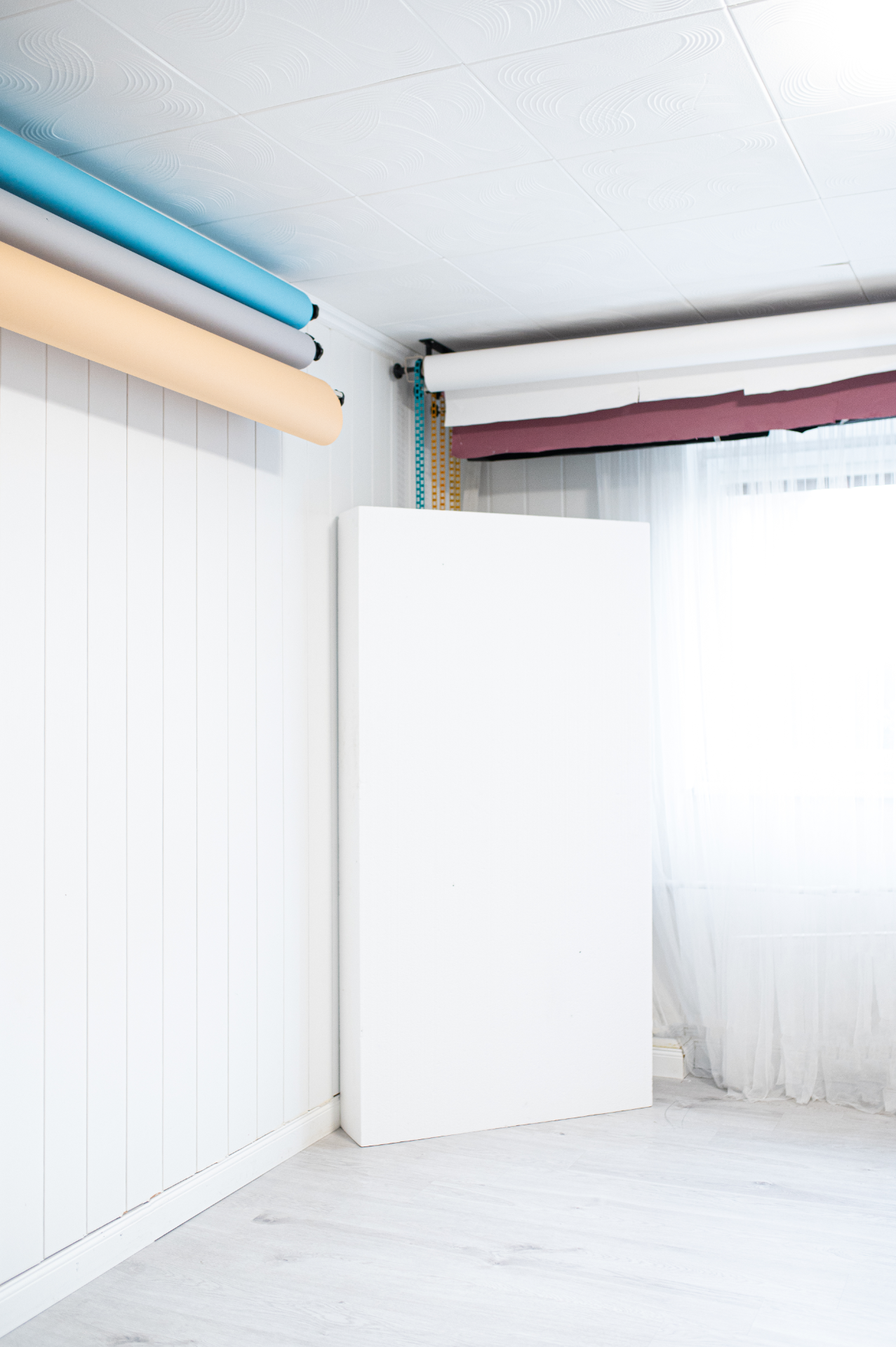 Druhá místnost nabízí šest různých barevných papírových fotopláten, které lze snadno měnit dle stylu focení. Součástí je také bílý minimalistický koutek ve stylu francouzského pokoje – bílé rámečky, světlá podlaha a čistý design vytvářejí perfektní kulisu pro moderní a čisté snímky.